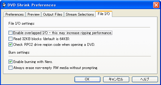DVD Shrink のインストールの後で NERO をインストールした場合は、「Edit」>「Preference」メニューを選んで、表示される設定タブの「File I/O」を開いて、下から2番目の 「Enable burning with Nero」のチェックを入れる。