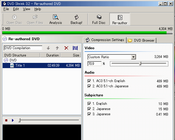 全体を一枚のDVD-Rに納めるような場合は、「Custom Ratio」を選んでからその下のスライドバーをスライドさせて圧縮率を変え、左の窓の「Size」の数値(コンテンツが幾つかあればその合計値)が 4.3GB程度になるところで止める。