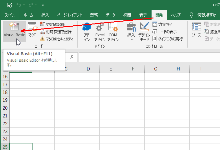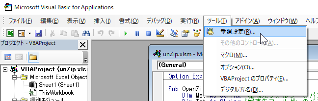 ここでは Excelで VBAをプログラムする初期設定から、簡単なプログラムの一例として Zipファイルを解凍する方法を示す。
