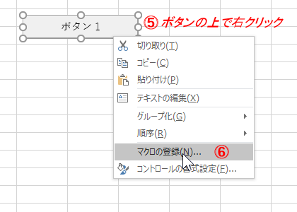 ⑤ そのボタンを右クリックして ⑥「マクロの登録」を選択。