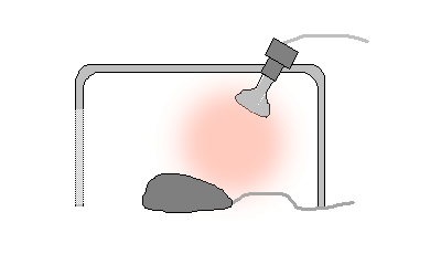 で考えたのが下のような装置。これをマウスにかぶせたら快適なんではないかということ。ただし、電球をそのまま AC100Vにつないだのでは熱も明るさもかなり強くなるだろうという目論見で、100V 20Wくらいの電球を半分以下の電力で使うことで光よりも遠赤外を多くして効率的に手を温めようという魂胆。