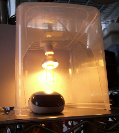 発想は 昔子供のころ縁日で売っていたヒヨコを飼うための飼育器。あまりはっきりとは覚えていないが、冬の寒い間はヒヨコを飼うのに 数十W程度の電球をヒーターとして使っていたような記憶がある。電球も結構な発熱を伴うので熱源として利用できる。あるいは高校時代放送委員会に所属していたが、冬の間の役得は管球式アンプの電源を入れておいてその上に弁当を載せておけること。他の人たちは氷のように冷め切った弁当を食べているのに、放送委員の一部だけは登校したらまずアンプの上に弁当を置いて授業に行く。昼休みは放送室でぬくぬくとした弁当を食べられたという美味しい思い出。