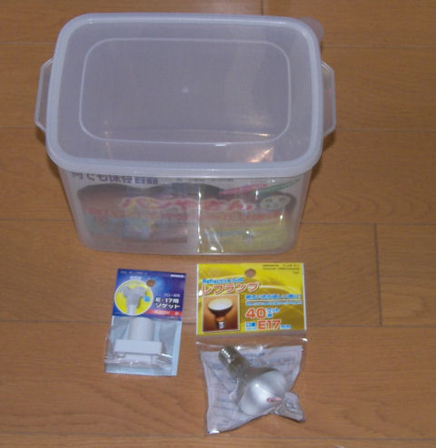 何時ものようにまず百均で利用できそうなものを物色。下の写真のパンケース(12Wx20Dx14H)と15Wレフ電球を購入(写真は 40Wだが別途 15Wを購入)。さらにホームセンターで レフ電球用のソケットをこれも 100円で購入。電線を接続するためのコネクタや電力調節用のダイオードは部品箱の中のストックを使用。出費は消費税込みで総計 310円。
