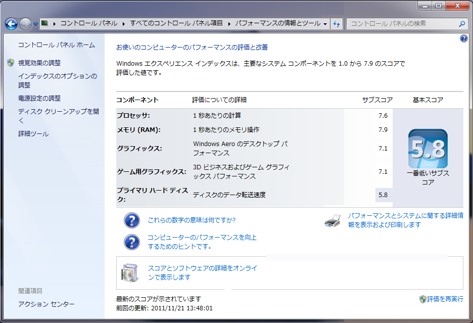 ここからやっと Windows7 のインストール作業。 XPのころから比べれば随分とインストール時間は短くなったが、それでもチップセットのドライバ類など一通りセットアップが終わるのに 約 3時間。この状態でまずは Windows experience を実行してみる。スクリーンショットの画像がどこかに行ってしまったが、記憶ではHDDが 5.8、ゲーム用グラフィックスが 6.3くらいだった。その他の数字は、下の方にある HD6670をインストール後に測定した結果と同じ。