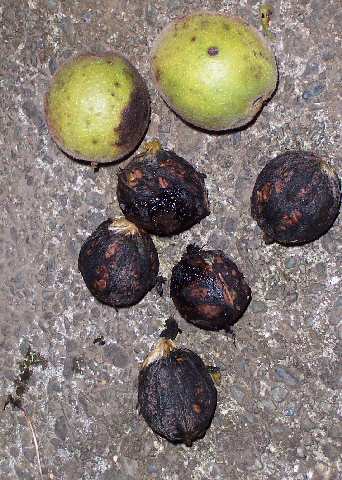 山道の散歩 その3です。 栗やドングリ、そしてクルミの実が落ちています。栗は人が歩くところに落ちたものは、「早起きは三文の得」というような朝早い散歩の人に拾われ、午後から散歩しているような私には拾えません。山に入っていけば拾えないことも無いのですが、顔や手に荊の引っかき傷を覚悟しないといけません。 と思っていると、足元にクルミの実が落ちていました。クルミは写真の上の二つのような実が木から落ちて、周りの果肉が腐って、下のようないわゆるクルミの殻(実)が露出します。更に食べるクルミはそれを乾燥し、火で炒って中身の核を取り出します。 何故か、昔からクルミは栗ほど人気が無く、落ちていてもあまり拾う人が少ないようです。そういえば、2~3日前に国道で、カラスがクルミの実らしき塊をくわえて車道の間をうろついていました。新聞などで読んだことはありますが、カラスがクルミの実を車に轢かせて割ろうとしているようです。目の当たりに見て、カラスの知恵に脱帽しました。 で、私は散歩のついでに 20個ほど拾ってきて、腐りかけた果肉を剥いて干しておきました。でも賢いカラスに見つかったら、国道に持っていかれるかも知れません。