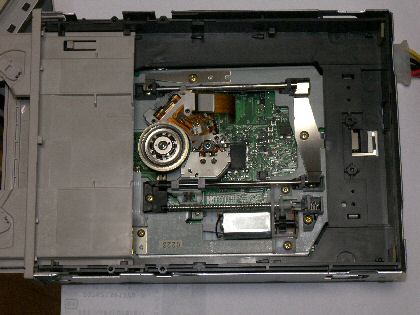 実は、携帯電話に付いてきた au Music Port というアプリは Windows-Xpでしか動作しない。私は Xpはサブマシンとして、古いPCにインストールしてあり、メインのマシンは今だに Windows2000。 この Xpのマシンには、昨日書いた CDドライブ(東芝 XM-6202Bというx32倍速の古典的なドライブ)の他に、Ricohの MP-9102(だったかな?)という CD-R/RWとDVD-ROM対応のドライブも搭載している。今ではCD/DVDのマルチドライブというのが常識になってしまったが、このドライブは、CDドライブとDVD-ROMドライブがコンボになった初期のもの。しかしこちらのドライブはしばらく前から、電源が入るとインジケーターが点滅したまま、CDをかけても読み込んでくれない。 CDドライブもDVDドライブも何台かあるので、別にこれが故障していても不自由はないが、どうせならこのドライブで aMPが楽曲変換してくれるかどうか確かめようと、思い切ってばらしてみることにした。 写真のように、ドライブのメカ部分を取り出して、この状態で電源を入れて動作させてみた。インジケータだけを見る限りでは、ディスクの上側の押さえを外すと問題なくなるようだ。あるいはドライブを縦にすると問題なさそう。 横置きにした場合、重力で真ん中のディスク駆動モーター部分が 0.何mmか下がるが、そのせいだろうかディスクの上側の押さえがガイドのプレス部品と摩擦してしまいモーターが回転していないみたいだ。 他の部分からグリスをこそいできてこの部分に塗ったり、プレス部品に力を加えてわずかに変形させて モーターの沈み込んだ分をキャンセルさせようとして見たが効果はない。 残念だが、一旦諦めてケースを元に戻した。