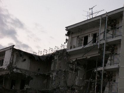 去年末から、隣の元自動車工場の社宅の解体作業が始まった。 自動車産業のリストラで使われなくなって無人化していた社宅の建物2棟を重機で壊している。 何ヶ月もかかって作られた鉄筋の建物が、わずか数日であっという間に解体されていくのだが、それよりも、ここで何百人もの人が生まれ、あるいは何千人もの人が生活していた空間が、綺麗に跡形無く消し去られていく様を見ていると、はかなさ、むなしさのようなモノを感じる。 後にはきっと瀟洒なマンションが建設され、新しい人たちが移り住んで、再び何百人ものドラマが生まれるのだろうけれど、一体人が暮らすってどういう事なんだろうと、日曜日でしばし解体作業が休んでいる現場の前に佇んで思いにふけった。