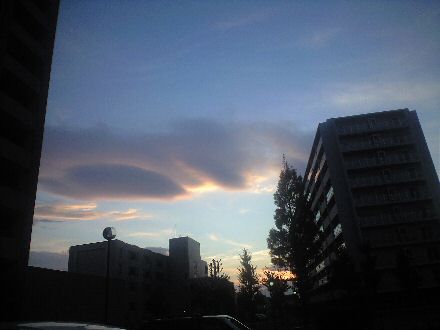 今日午後いっぱい、サーバーがダウンしていたようだ。今までも時々、短時間 FTPがつながらないことはあったんだが、メールサーバーや、親のレンタル会社のサーバーまで表示されない事はなかったのに、今回は半日以上、しかも http/FTP/Mail と全てのサーバーがダウンしたようだ。 もしかして、時節柄 倒産して電気でも止められてしまったのかと心配していたら、午後7:00過ぎにメールが入り始めた。単なるサーバーエラーのようだが、どうもHWが老朽化しているのだろうか? そろそろレンタルサーバー屋さんを乗り換えた方が良さそうだ。次回更新が来年の4月なのでそれまで待とうと思っていたんだが、そんなことを言っていると、データが飛んでしまいかねない。 今日の写真は、そんな話とは無関係に、数日前の夕方 娘を迎えに行くので車を出そうと駐車場に行くと、西の空にきれいな・・・というより面白い形の夕焼け。そう言えば今年は、なぜかあまり夕焼けに気付かない。西側に建設されたマンションのせいか?