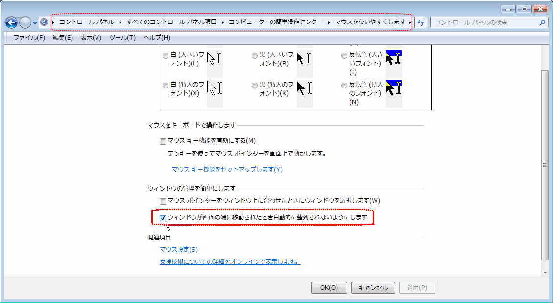 最近、Windows7機でアプリを開くとなぜかウインドウサイズが小さく、SVGAサイズくらいになってしまうようになった。モニター画面が大きくなったのに、アプリ画面が小さすぎるのでそのたびにウインドウの隅をドラッグしなければならず面倒この上ない。特に設定をいじってはいないのでWindows Updateのせいではないかと疑っている。 原因はともかく対処方法をネットで探すと、どうやら以下の方法で治るらしい。 「コントロールパネル」 > 「コンピュータの簡単操作センター」 > 「マウスを使いやすくします」 を開いて、「ウインドウが画面の端に移動された時自動的に整列されないようにします」のチェックを付ける。表現と現象には若干の違和感があるが、とにかくこれでアプリは前回終了時のウインドウサイズで開けるようになったようだ。