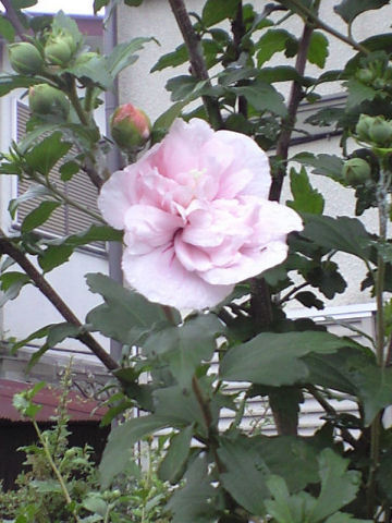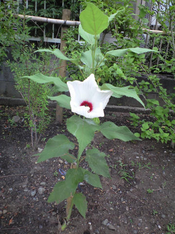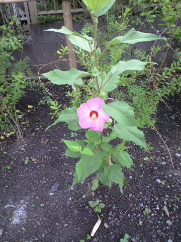 昔、子供時代に 日照りが続くと大人が「そろそろ『お湿り』が欲しい」というようなことを言っていたことを ここ数日思い出していた。というのも中学校の校庭でサッカーの試合があるたびに土煙がもうもうと上がって、折角 風が若干秋っぽくなってきたのに窓が開けられないと嘆いていた。 それが今朝から本当に「お湿り」と呼ぶにふさわしい雨降りになった。雨音で「もしかしたら」と窓の外を眺めるとすでにかなりの降りになっており、すぐにザーザー降りになってきた。目の前の公園の地面はあっという間に水溜りから川状態に。 その後もほぼ一日、降ったり止んだり晴れたりの天気で気温はいっぺんに秋になったようだ。ただし湿気もかなりなもので、ジョギングでは昨日同様の流れる汗。 今日の写真は アオイ? フヨウ? 葉の形からするとフヨウではないような気がするんだが、樹形からするとアオイでもないのかな? 何れにしても一朝限りの儚い花。