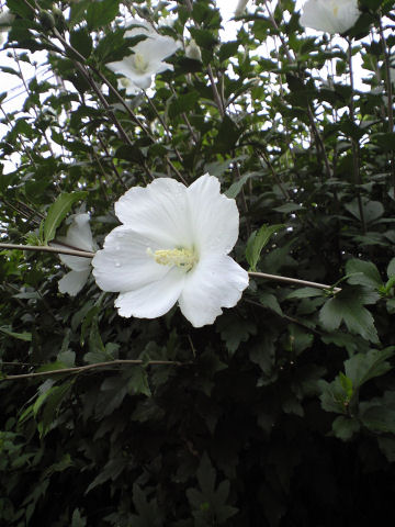 いよいよ梅雨が開けたと思ったら、途端に猛暑がやってきた。 昨日はいきなり熊谷で 39℃を記録したらしいが、今日も暑かった。夕方のジョギングで吹き出す汗は半端ではない。汗を拭うハンカチもすぐにぐっしょりしてしまう。 そんなジョギングの最中、すでに夕闇が迫っている木立の上の方から「ジーッ」と鳴く虫の声が聞こえる。今の時期、他に考えられないので多分セミではないかと思う。まだ羽化してまもなく、鳴き声も一人前ではないセミだろう。 いよいよ今年も酷暑の夏がやってきた。 今日の写真は、朝の散歩の道端に咲いている真っ白なムクゲの花。ピンクや紫のムクゲはあちこちに咲いているが、白いムクゲはここだけでとても珍しく目立つ。