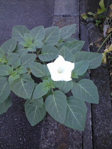 昨日のこの日記で「ユウガオ」かな?と書いた植物に実がついているのを見つけた。 今日は朝から風が強く、ちょうどその花のところを通りかかった時に、風で葉っぱがめくれて下から緑色の栗のイガのような実がのぞいていた。あのユウガオのヘチマの親戚のような実とは似ても似つかず、気になったので Webで検索してみた。 花は似た花がいっぱいあるので、花の写真では分からなかったが、この実はどうやらチョウセンアサガオと言うらしい。 Webの写真を見ていて、ちょっとびっくりしたのは、この実や葉っぱや根っこには意識障害を引き起こす有毒物質が含まれており、食中毒の報告が結構あるらしい。どれも、保存しておいた根や実を間違って食用にしてしまった事故らしいが、こんな植物をなぜ保存するんだろう?ケシが栽培禁止で、この植物が野放図なのは解せない。 この花は、路上のアスファルトと側溝のコンクリートの境目から芽を出したようだが、誰がこんなところに種を持ち込んだんだろう? 付近の人は有毒だということを知っているんだろうか? 花が真っ白な大ぶりで目立つだけに気になった。