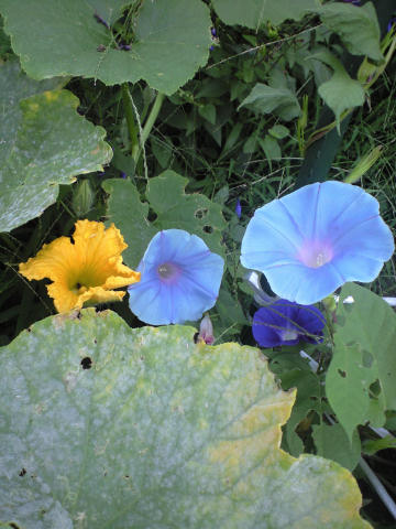今日はかなり暑かった。一旦涼しくなりかけた時だけに暑さがひとしお感じられたかもしれないが、沖縄の方を通過した台風の進路が変わって熱い空気を運んできたのだろう。朝からだんだんに蒸し暑さが増してきて夕方のジョギングでは今年一番の大汗をかいた。本当に雨に濡れたような汗だった。 もうかれこれ3週間以上雨が降っていない。目の前の中学校の校庭は毎日水を撒いているが本当に「焼け石に水」で生徒が走り回ると砂煙がもうもう。そろろそ「お湿り」が欲しいがこの先 1週間もあまり雨は望めそうにないようだ。 今日の写真は、並木通りの草むらで見つけたカボチャの花と朝顔。カボチャの花は数日前にも同じツルで見たので、この花はウラナリだろうけれど本当に良いコントラストだ。