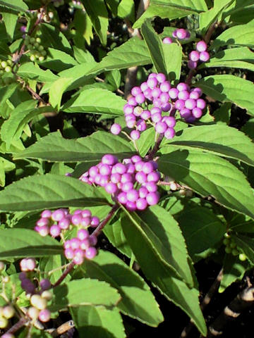 昨日あたりから季節がガラっと変わった気がする。昼間はともかく、一昨日の雨のせいだろうか? 朝の空気が急に冷たく感じた。 で、昨日も散歩しながら「セミももう鳴かないかな?」と思って歩いていると、隣のゴルフ場の中から一匹の声が聞こえてきた。朝なのでミンミンゼミ。「ああ、これがおそらく最後だろう」と思っていたら、今朝もまた聞こえた。オマケに今日は、夕方になってミンミンゼミの声とヒグラシ数匹の声が同時に聞こえた。一時期よりは力強さが感じられず、一方虫の声もかなり大きくなっているが、まだまだ虫の音には渡したくないとでも言うように頑張っている感じ。 そんなことを考えながら歩いていると、緑の葉の間から鮮やかな小さなピンクに輝く花?と思って近づいてよく見ると花ではなくて実。どうやら萩の実らしい。(<<後日記:ムラサキシキブと判明) 写真では朝日が当たっているので紫~ピンクの実はかなり色が褪せてしまっているが、実際はもっと紫が濃くて輝くように鮮やか。写真を見ていて、子供の頃こんな感じのハッカ味か何かのお菓子を食べたような曖昧な記憶が蘇ってきたが、詳しくは思い出せない。
