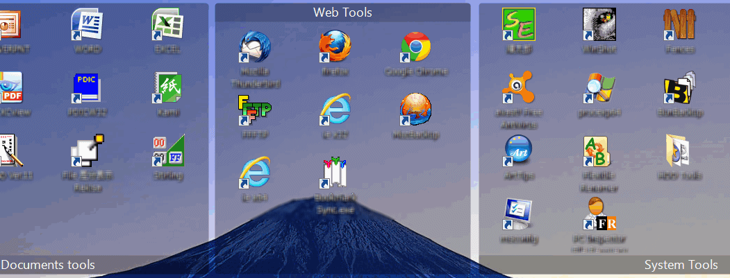 デスクトップに「垣根」を作ってアイコンを囲い込む Fences というフリーのツールがあって、つい散らかるデスクトップのアイコンをカテゴリーごとに分類するのに便利に使っているんだけれど、「垣根」のタイトルが垣根の下側に表示されていたのに いつの間にかその内の一つが上側になってしまった。 まぁ、使い勝手に問題はないのでそのままにしてきたが、ちょっと気になって設定などを見渡したが、どうもタイトルの位置なんて感じの設定項目は見当たらない。 Webで検索しても、どうも引っかかってこない。暫く悩んでいて ふと気づいた。「垣根」はタイトルの部分をつまんでドラッグすると自由に移動させられるんだが、それをデスクトップのヘリまで持って行ったらどうなるのか? やってみたら、なんのことはない、デスクトップの上側にドラッグしたら、上側にあったタイトル欄はクルッと下に移動してしまった。下に別の Fenceがある場合、そこに触れると今度は上側に移動する。要は Fenceは重ねることもできるが、重なってしまった時にタイトルが見辛くなるのを避ける工夫らしい。うまく工夫されているのはいいが、簡単に移動しすぎて気付かなかった。 左の図は、真ん中の「Web Tools」というタイトルだけが上側に移動した時のもの。
