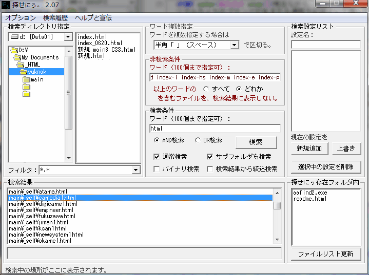 最近、ちょっとPC内のファイル検索で引っかかったのでメモ。 通常のExplorerや検索専用ツールの「検索」操作では、検索したいワードが含まれたファイルをすべて検索するという処理が行われる。しかし時には「あるワードが含まれていない」ファイルだけを検索する、という処理がしたくなることもある。 例えば今回、私のHPの全ての HTMLファイル(6百数十ページ!!)からアクセスカウンターが搭載されていないページを検索しようと思ったんだが、アクセスページの表示ストリングはいくつかのパターンがあるので、それらのパターンをすべて OR で登録しておいて、それらのどれも検出されないファイルだけをリストアップする必要が生じた。 でいつものごとく、Vectorなどでフリーのツールを探してみた。通常の検索ワードに「-」記号を付けて否定検索するツールなどが幾つか見つかって試してみたが、使い勝手はイマイチなモノが多い。単純な排他的論理和の操作ながら、わかりやすさという点では結構違う。で最終的に残したのは「探せにぅ」という何ともポップな名前のツール。否定のワードを入力する窓が別にあるので排他的論理和と排他的論理積の区別がつきやすい。しかしどうやら作者は今年5月以降 プログラムの更新もブログ更新をもしていない様子だが、現状でとりあえず目的を達しているので、2回ほど使わせてもらった。 そんなことのなんやかんやで、このページトップにあるアクセスカウンターを別ページから分けたため、カウント数がリセットで一遍に減少してしまった。トータルでは変わらないというもののちょっと寂しい感じもする。