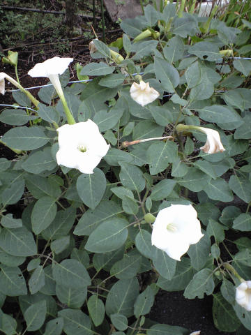 今朝は、朝から北風が吹いてかなり涼しかった。大陸の高気圧からというより南海上の台風に向かって吹く風だと思うが、わずか 1週間前の気温からは想像できないほどの温度の変わり様だ。 体調も気分も全然ついていけず気分はまだ半ソデ半ズボンの気分で、ズボンこそ長ズボンにしたが、上は半袖のまま散歩したが、歩き始めはかなり涼しく感じた。一気に秋の気配になってしまった。夕方のジョギングでは、6週目辺りになってやっと汗が吹き出した。 今日の写真は、1月ほど前にもアップした夕顔らしき花と同じ株に咲いた花。最初は1輪ずつ咲いていたが、最近になって一遍にたくさんの花をつけはじめた。実がなっているようには見えないが、花だけの夕顔もあるんだろうか?