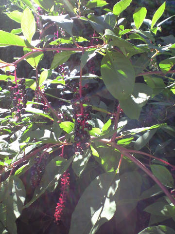 昨夜の大型台風17号が駆け足で過ぎ去って、この辺りの今朝は台風一過の日本晴れ状態。 日差しも強く、ちょっと歩いただけで汗が吹き出した。夕方、ジョギングを終わって、いつも通りに公園のブランコの横棒にぶら下がると、何故か鉄棒が湿って滑る。誰か先に使って、汗でもついているのかと思ったが、握りの部分をずらしても同じ。支柱の方ももっと濡れている。どうやら夕方からより温かい湿った空気が流れ込んで、冷えた鉄棒に露結したようだが、空は青空のままで、満月が綺麗だった。 今日の写真は、それとは知らずに撮影してきて Webで調べたらビックリ。前回に続いて 有毒な植物らしい。ヨウシュヤマゴボウという北アメリカ原産のヤマゴボウの仲間。実や根っこに毒があるらしいが、そうとは知らない人が名前や根の形で、間違えて漬物にして食中毒になることがあるという。私も「ヤマゴボウの味噌漬け」は好きで、故郷に帰ると買って帰ったりするが、あれがモリアザミの根だということは何となく知っていたが、それでもこんな名前の形迄も似た植物があったら騙されるかもしれない。「毒ヤマゴボウ」とでも命名しておけば間違いが減るだろうに、植物学者も罪なことをしたものだ。こんな人口密集地でも結構有毒植物が自然繁殖していることに驚いた。