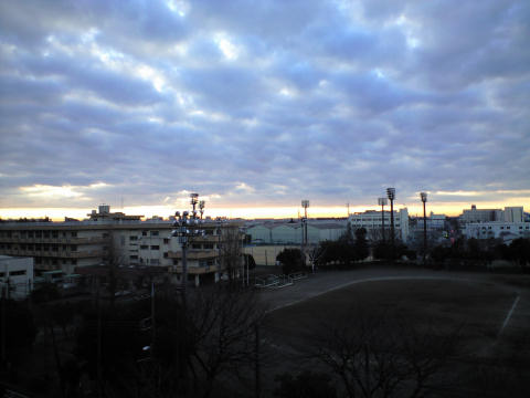 正月が済んだ・・・・と言っても、通勤しているわけではないので正月も普段もそれほど変わらないが、ウィークデーは娘を駅まで車で送る仕事だけが増える。 その後、外に出たついでに 3~4Kmのウォーキング~時々ジョギング。最近はスロージョギングと名前がついたようだが。身体はすぐに温まるが手と顔が冷たい。今朝の気温は 最低時より 2~3℃高めで車の車外温度計で 1℃。風も強くはなかったが結構寒く感じた。 記憶では、子供の頃 7日の朝は「どんど焼き」が行われた。田んぼの真中に暮れのうちに藁の上に青竹や松、杉の枝を積み上げて、6日に各家々から回収した松飾りなどの正月飾りを加えて日の出頃に日をつけて燃やした。その火でモチを焼いて食べたり、その火の付いた枝を家に持ち帰りその火で七草粥を炊いて食べたような記憶がある。多分古い記憶なのでどれかは違っているかもしれないが。 この辺りではそうした風習がなさそうで(昔はあったにしても時節柄、既にやめた可能性も高いが)、正月飾りの処置に困る。近くに神社もないし毎年悩んだ末に結局は買い物袋に入れて燃えるゴミとして出すんだが。 写真は今朝の朝焼け。恐らく今朝は毎年気になる一年のうちで日の出時間の最も遅い日になると思われるが、残念ながら十分日の出時刻を過ぎても薄雲で正確な日の出時刻は確認はできなかった。