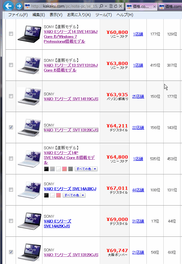 新しく依頼された仕事で、出かけて講義などをすることになったんだが、どう考えてもプレゼンテーションソフトを使うことになる。当初、プレゼンテーションを作るのは家のデスクトップ、作ったファイルをUSBメモリで持参して再生するのは先方のノートを借りる、という前提で考えたが今までの経験で、途中の電車の中で思いついたりしたことをその場で或いは先方についてから手を入れたくなることが多い。 考えてみれば、会社勤めを止めてから「ホームオフィス」を実践してきたので 5年近く自前のノートは使っていないことになる。それ以前から使っていた古い 2000年発売くらいの東芝製は 4年くらいまえに電源を入れてみたが起動せず、どうしてもという時は娘やヨメさんの 15.6inchのノートPCを借りていたが、それらももう古くてデスクトップ機に慣れてしまった今の私には画面や動作が気に入らない。何より、幅 38cm、3Kg近くと大きくて重いのでカバンに入らないから電車で移動は現実的じゃない。 等など、結局はヘリクツをつけてノートPCが欲しくなった。 最初、新聞広告でみるPCデポなどの情報で サイズやコストパーフォマンスから ASUSが出している iMac Airモドキの薄型Noteになるだろうと思っていたんだが、店頭で見るとそれらもどうもイマイチなので、改めて Webの 価格.comや量販店の Web販売サイトで 画面が 12-14インチで 2Kg以下という条件で物色してみた。 で、予想外にも Sonyの Vaio Tシリーズが浮上してきた。CPU i5 MS Officeプリインストールという条件で 2012年秋モデルが 6万円台半ばで入手可能。ヨドバシなどでは既に同じモデルは販売終了しているところを見ると、まもなく同等の新型に移行するための「タタキ」状態なんだろう、と想像。この日記でも 何度も「Sony製品は嫌い」と言っていたのに、F通やNECとのあまりのラインナップや C/Pの違いに宗旨変えを余儀なくされてしまった。まぁ、嫌いな理由の一つ、たくさんの余分なプリインストールアプリは購入直後、せっせとアンインストールするハメになりそうだが。 しかし、昨日見た記憶で Sonyのネット通販から直に「価格.com 限定モデル」として出ていた機種が、昨夜遅く見た時には既に消えていた。そして最初見た時には、同じスペックの通常モデルがそれより若干高かったのに、今日はそれらが昨日の限定モデルよりも300円ほど安くなっていて、しかも時々刻々 数円単位で下がっていく。Sony直販サイトは昨日で該当機種を売り切った&私が見たのは最後の在庫数台の情報ということだったのか? 全国の通販店が、価格.com 画面と首っ引きでリアルタイムで値下げ競争している様を想像すると、静止画面から緊迫感が伝わってきてなかなか面白い。 しかし、直販サイトは 3年間の通常保証込だし、一般の通販サイトは 5%程度の料金の上乗せで 5年保証など、保証条件まで考えるともう数日「待ち」という結論。 その間に 商品が「完売」で市場からなくならないことを祈っているんだが・・・・甘いかな?