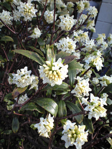 花の写真だけ。 白花沈丁花(シロバナジンチョウゲ)だろうか? 白い花はほとんどが地味で、咲いていても見逃してしまいがち。香りも花粉症の鼻にはほとんど届かない。この花も、何日か前から道端に咲いているがあまり気にしていなかった。