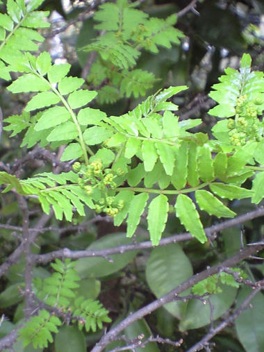 ここに、実の写真をアップした記憶があったが、これがその花。房の根元の方は既に緑色の実になっているようだ。 すでに 1mほどの高さに育っており、さらに高くなりそう。花は房状で、1つずつの花は 数mmしかないがトラノオ状にたくさん付いている。 | |