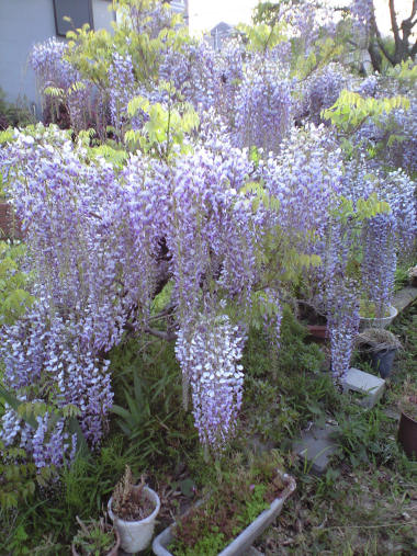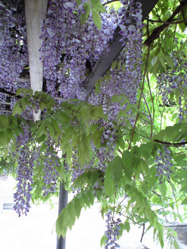 とりあえず写真だけ。 散歩道の北側の突き当たりにある藤の花。10日ほど前から咲きはじめたが、丁度満開になった。重いほどに見事な房だ。カメラと光線の関係で、紫色が若干薄くなってしまった。近くの人の話では肥料も手入れも何もしていないとか。 | |