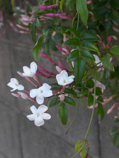 まだまだ白い花が続く。 黄色いジャスミンは昔住んでいた藤野の道沿いにも植えてあって、一斉に花が咲くと当たり一面に香りがした。この花は、並木沿いの民家の塀の中から外に垂れ下がっているツルの先に咲き出した。数日前から、赤い蕾が膨らんでいたので、そろそろだろうかと毎日待ちかねていたら2日ほど前に1輪が咲き、この写真を撮影したのは昨日。鼻を近づけると私の鼻ではかすかに匂いが感じられる程度。まだ一分咲きにもならないくらいで、満開になると相乗効果でもっと強くなるのだろうか。それとも開花してしばらくしないと匂いが強くならず、そのためまだ弱いんだろうか? 中央林間の駅そばのビルの垣根のところに咲いていたジャスミンは、何も知らずに歩いていたのに私でも匂いで気づいたくらい強い香りがしたことを思い出して、後ろを通り過ぎる散歩の人たちの視線を気にしながら観察してきた。 | |