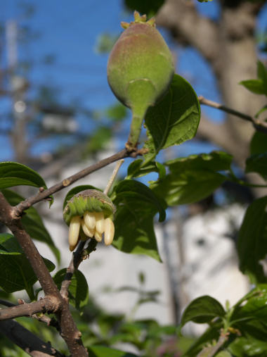 最初に開花したのはもう半月以上前の 5月下旬になるけれど、最近かなりな数の花が咲きはじめた。去年は 3個ほどしか実がつかず、口が割れた写真を撮ろうと思っていたが結局割れる前に誰かに取られてしまったのか、実がなくなってしまい果たせなかった。今年は花がたくさんついたので期待できそうだ。 | |