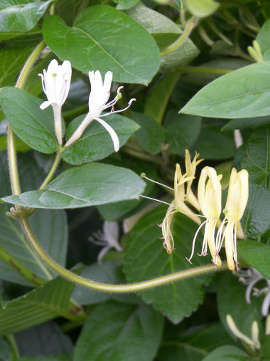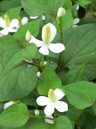 花は綺麗だし、見方によっては真っ白な花びら(実際には総苞片という部分らしいが)にすっくと淡い黄色の集合花がそびえた様は高貴な感じすらする一番身近な薬草なのに、名前のせいか ありふれた草花のせいか、それとも匂いのせいだろうか あまり人気がない花だ。日陰の薄暗くジメッとした所を好んで咲くからかもしれない。花の真ん中の棒状の花序という部分が実際には小さな花の集合で、密集した個々の花は黄色の雄しべと雌しべだけがあるということらしい。 子供の頃に、切り傷ができたりすると血止め?消毒?として生の葉っぱを揉んで傷口に付けた記憶があるが、あの頃は「おまじないかな?」くらいにしか考えなかったが、思い出してもその後傷が化膿したりした記憶はないから、実際効いていたのかもしれない。漢方薬としても利尿作用、動脈硬化の予防作用があるというから、味さえうまくごまかせれば飲んでみたいものだ。 | |