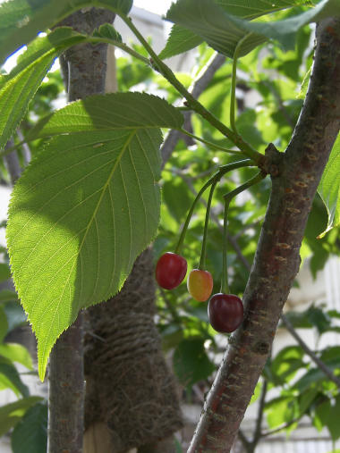 散歩している並木の端っこに「陽光」という桜の木が整地された後に新しく植わっている。その木の若葉の間に、色づいたさくらんぼが覗いていることに気づいた。 この写真は 1週間ほど前に撮影したものだが、色づいた順に鳥が食べるのか今朝見た時には 1個しか残っていなかった。それとも頭の黒い鳥だろうか? | |