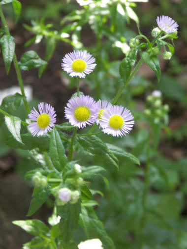 荒地などどこにでも咲いている雑草だが、名前を知らなかった。ヒメジオンという花とハルジオンという似た花があるらしいが、この花は葉の付き方などがハルジオンだと思う。 今回、よくよく見たら蕾のうちは先端が少しピンクがかっている。小さな菊のような花だが外来種で帰化植物らしい。花の雰囲気に似ず、繁殖力が強く侵略的外来種ワースト100に指定されているとか。道理でどこでも見られるわけだ。 | |