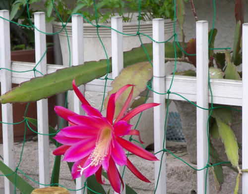 散歩道の途中の家の垣根から外に向かって、艶やかな花が咲いていた。月下美人? 白かったんじゃなかったっけ・・・というより、夜咲いて朝はしぼんでしまうから「月下・・・」と名前がついたような? と思って Webで調べたら、同じ仲間の クジャクサボテンの花らしい。こっちは、昼も咲いているとか。 でも、こんな咲き方をしたら 家の人はわざわざ外に出てこないと花が見えない。家の方を向かせたくても、フェンスの柱間隔より花が大きいから抜けないだろう。散歩する人を楽しませるなんてなんとまぁ、サービス精神旺盛な。 明日の朝はどうなっているんだろう? | |