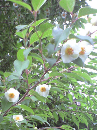 写真は日本では一般にシャラと呼ばれる夏椿の花。仏陀入滅の時、周りに咲いていたという沙羅の木・・・・はどうやらこの木ではないということらしい。 「奢れる平家は久しからず」の 祗園精舎の鐘の声 諸行無常の響きあり 沙羅双樹の花の色 盛者必滅の理をあらはす はどっちなんだろう? 推理としては、この頃に南国インドのシャラが日本に花のつく生のままでもたらされたとは思えず、作者が本物の沙羅を見たとは思えない。だから当然「夏椿」の花の色を言っていると思われる。ここには、今ですら日本で本物の沙羅の木はここ(滋賀県草津市立水生植物公園(みずの森))でしか見られないと書いてあるし。写真を見る限り、花の形は夏椿とは似ても似つかない。 ・・・まぁ、「夏椿の花の色 盛者必衰の理をあらはす」では祇園精舎とは繋がらず全くストーリーにはならないから、あまり追求しないほうがいいか。 それにしても修行が足りない私には、どう見てもこの夏椿の花の色が「盛者必衰」には見えないんだが。それとも木に咲いているときは高貴そうな透き通ったような白で落下した途端、薄汚い茶色に変色するからだろうか? それよりも、花は確かに小さな椿と言われればそうも見えるし落花の仕方もポタリという感じで椿だなとは思うが、1cm程度の花の大きさではむしろ、昔見たお茶の花に似ているような気がするが、どっちにしても椿の仲間だから当然か? | |