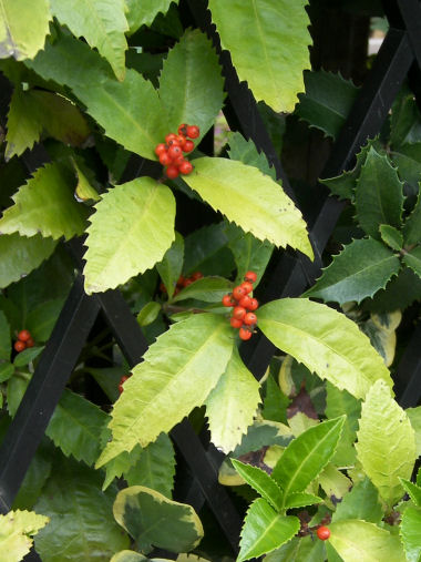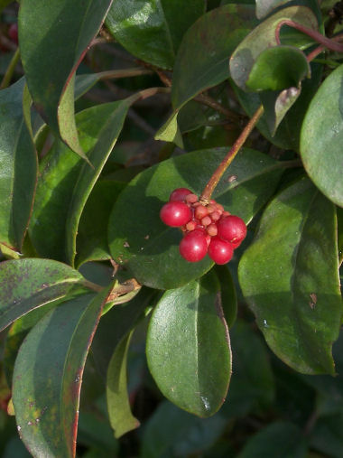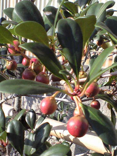 今日の写真は、名前を忘れたがクロガネモチとかカナメモチとかの仲間だろうか?1cm弱の実が赤く色づき始めた。 | |