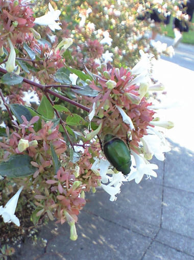 今日の写真は、アベリアの花の蜜を吸いに来た?コガネムシ。コガネムシは葉っぱを食害するとされているが、蜜も吸うんだろうか? | |