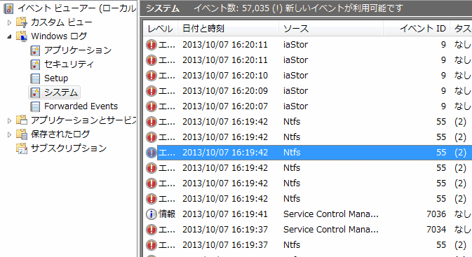 今日は一日暑かった! この時期にしては異常な 30℃超えという気温もさることながら、またまた PCの不調でやらなくてもいいことをやってドツボにハマるいつものパターンでオーバーヒート気味。 ついこの間、メインマシンでバックアップ領域不足の警告が出たので、HDDを 1TB>2TBに交換したが その前後から若干動作がおかしくなった。最初は Explorerのブラウズが切れたり、応答しなくなったりという現象だが隣のサブマシンだと問題なくサーフィンできている。ルータより上流は問題ないことになるのでネットワークの設定か関連ファイルがおかしいのかと思ったが、Google Chromeや FireFoxは特に問題無さそうで、こちらを規定のブラウザに切り替えて凌いでいた。それがこの 3日ほど時々 Explorerがハングアップしたり、最悪O/Sがクラッシュして突然リセットが発生するようになった。最初は 勝手にバージョンアップされた Explorerの Ver.10のせいかとも思ったが、再起動時に DSKCHKが走るし、どうも O/Sの入っている SSDが部分的にエラーっぽい。で、CristalDiskInfoを起動して SMART情報を表示させるが、診断は「正常 100%」で各指標値は殆ど問題ない値。ただ生の値で「ECC訂正不可能エラー数」や「リードエラーレート」という項目が<数百万(十進)>という値になっているのが気になる。「代替処理発生回数」も一桁ながら「0」ではない。  で、Windowsのイベントビューアを起動してエラーログを見ると 「iaStor」や「Ntfs」という ストレージ関係のエラーがズラーッと並んでいるではないか!!!  これはヤバイっ! というので、早々にバックアップを取ろうとしたら O/Sのシステムバックアップでも Paragonのバックアップでも開始早々に「I/Oエラー」で止まってしまう。ウ~ン、まだ 1年と使っていない ADATA製 SX900シリーズの SSDなんだが、やはり SSDなんだと思い知らされた。今年の夏の高温が命取りに成ったのかとも思ったが、CristalDiskInfoの温度の表示は最悪値が 46℃でマージンはあったと思う。O/Sのドライブながら書き込み失敗は「0」なので、どうやらフラッシュメモリのセルから長期的に電子が徐々にリークしていっているような??? フラッシュも揮発するなら一定期間(1ヶ月とか)でリフレッシュが必要?なんて冗談にもならない。 さて、どうしたものか? 1年以上まえのバックアップを HDDに戻そうか・・・・と昨夜遅くまで思案して、SSDのファームのアップデートを探して更新したり、悪あがき。しかし、状況は一向に改善しない。意気消沈して寝たので、今朝は寝覚めが悪かった。 それが今日昼過ぎに、ダメ元と思って再度 O/Sのバックアップでシステムを含めてバックアップして、期待しないで暫くの間外出して戻ったら 何となくエラーが出ないで終わったっぽい。バックアップの中身を覗くと一応 Windowsフォルダも見える。慌てて、今度は Windows上で Paragonの DriveBackup & Recoveryを走らせてみたら、30分程度で何もなく終了。 試しにそのバックアップを別のHDDに Restoreしてみると、エラーは出ない。Windowsのインストールディスクで修復を実行したら、なんの問題もなく立ち上がってしまった? 昨夜までのあのリードエラーの嵐は一体何だったんだろう?? リストアしたO/Sで Explorerを 数分だけ実行してみたが、その間は特に問題も出ない??? 狐につままれたような気分だが、とりあえず最悪の事態は避けられた模様。 と言うことで、念の為に バックアップしたディスクイメージを使って、常用 2TBの HDD先頭に残しておいた空き領域にそのイメージをリストアして、イザという時の緊急対応用とすることに。