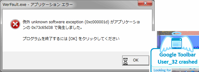 昨日書いたように、メインマシンの O/S用として使っていた ADATAの SSDがリードエラーを吐き出し始めた様子。周囲温度などの影響を受けるのか、一昨日はバックアップイメージも取れなかったのに、昨日はラッキーにも何故かとれたので HDDにそのバックアップイメージをリストアして、万が一 SSDでは立ち上がらなくなったりしたら そのHDDから立ち上げて緊急対応するようにした。 で、O/S再インストールという恐怖が遠のき落ち着いてツラツラ考えるに 夏の間問題なくて、秋に入って不具合が出始めたものの 昨日は 30℃超えという異常高温か何かが幸いして読み出せたなら、これから気温が下がるに従いエラーは増えるだろう。しかし、SMART情報などでは書き込みエラーが出ていない様子なので、もしかしてバックアップを SSDに書き戻せば フラッシュのセルに再び正規の電荷が注入(リフレッシュと等価)されて、また暫くは問題が出ないかもしれない。 これはかなり大胆な憶測だが、SSDに使われているフラッシュメモリは電荷蓄積で記憶保持する素子だから、製造工程の僅かな不良で電荷のリークが若干多いセルが出来てしまったら、あながち根拠がないとはいえないだろう。それに最近のフラッシュメモリはマルチレベルセル(MLC)で、電荷の多い少ないを読出しゲートのスレッシュを切り替えて読み出しているわけだから、それが読み出し時のチップ温度に依存したっておかしくない。SSDは書き換え回数による寿命が専ら懸念されているが、長期データ保存性能の方だって品質管理的には難しそうだから市場にそうした特性のチップが流出することだってあり得るだろう。と、そう考えると試さずにいられない質。なんたって民生品で最初にEEPROM利用を実用化するため電荷蓄積の信頼性は結構勉強したし、その後もフラッシュの信頼性について T社やSum社などのエンジニアからは随分レクチャーを受けたという生半可な自負が災いしてしまう。 そんなことを考えながら、今日は再び SSDの方の O/Sを立ちあげて IEを使ってみようとしたら 今日は Explorerが最初からエラーで立ち上がらない。エラーは下図の通り Werfault.exeという警告表示か何かのエラーだが、Solutoさんは Google検索バーのアドオンの実行がクラッシュしたと教えてくれている。昨日より 2~3℃気温が下がったせいかな?Explorer 関連ファイル記憶域の近傍がどんどん潰れていくのが目に見えるようだ。  1ユーザとしては症状が悪化したんだから喜んでいいのかどうか分からないが、予想通りだ。と言うことで、SSD上の O/Sをこのまま使い続けようかどうしようかと言う僅かに残っていた迷いが消えて、サッパリ SSD上の O/Sを書き換えることにした。とそこで何時もの悪い癖。どうせ書き換えるなら 最近何かと興味本位でインストールしたアプリなどのゴミもサッパリ捨てられるように、SSDに載せ替えた今年初めの頃のバックアップイメージで書き換えることにした。今年インストールしたいくつかのアプリのうち、使い続けるものはもう一度インストールし直さないといけないが、まぁゆっくりとやろう・・・ということで。 そんなこんなでとりあえず O/Sのバックアップを SSDに書き戻してInternet Explorerを起動してみると、当然 何の問題も出ない。そう言えば 勝手にアップされてしまった IE10も何かと良くない噂を聞くなぁと思い出し、慌てて IE10へのバージョンアップをブロックするコマンドパッチを実行して、IE9のままで使うことに。 念のため、Windowsのイベントビューアを確認したが、3時間ほど実行した今のところ ストレージ関係のエラーは一つも出ていない。何か あまりに憶測が当たりすぎて怖いような? しかし気分的に一番の収穫は、何ヶ月か前に、Fencesというデスクトップのアイコンの区割りソフトの「バージョンアップのお知らせ」を無料と間違えて有料のお試し版にしてしまい、起動の度に「期限切れ・Purchase」というダイアログが表示されて鬱陶しかったが、バージョンアップ以前に戻せたのでこれが出なくなったこと。 今後はキチンと 3ヶ月に一度くらい O/Sのイメージバックアップをとっておいて、不調になったらそれを書き戻して使い続けてみよう。