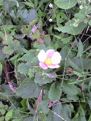 今日の写真は 名前を知らないが、散歩道の途中の花壇に咲いていた花。珍しく今頃咲いている。と思っていたら、今朝見ると 心無い人に根こそぎ取られてしまったようで、ぽっかり土に穴が開いてなくなっていた。(後日記入:シュウメイギクだろうか? よく知っている背がスッキリと高く白い花を付けるシュウメイギクとは草丈も花の色も違うが、Webで似た花を探したらそうらしい) | |