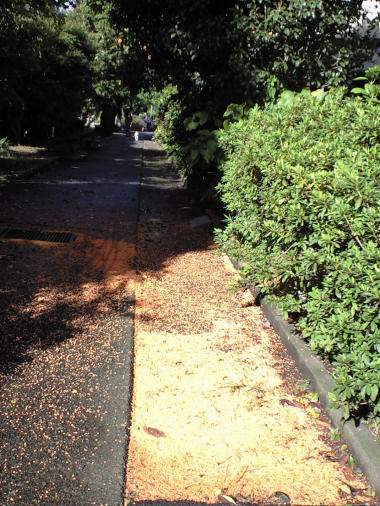 今日の写真は、今朝早朝に通りすぎた台風の風で散り敷いた金木犀の花の絨毯。朝日があたって黄金色に輝いている。 | |