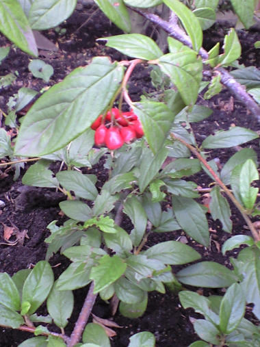 今日の写真は、赤くなったアロニアの実。**訂正:花の頃からずっとこの木がセイヨウカマツカ(アロニア)だと思っていたが、後日 樹木名の札が下がっていた。「コトネアスター」というインド~チベット原産の刺のないバラ科の樹木だという。名前がわかって検索すると、そのものズバリの写真が沢山見つかった。そう分かって見れば確かにノイバラの花に似てはいる。** | |