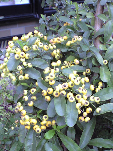 今日の写真は、色づき始めたピラカンサの実。赤い実はよく見るが、これは黄色い実のようだ。 | |
