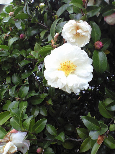今日の写真は、このあたりでは 3週間ほど前から咲き始めた八重のサザンカの花。この写真を撮った時点ではもう散った花も多かった。 | |