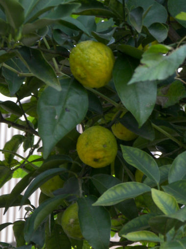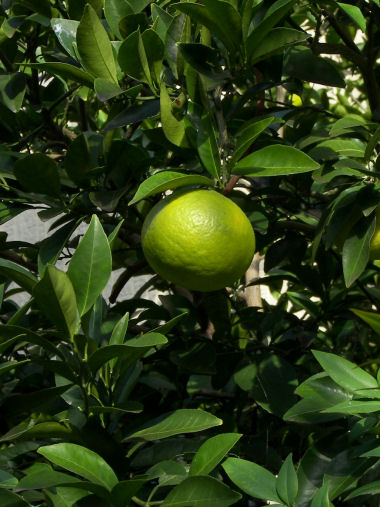 写真だけ。こちらはまだ青い夏ミカンの実。特に夏ミカンはこの辺りでは酸っぱすぎるせいなのか、春先過ぎても もがないで木にぶら下がったままのことが多いようだ。 | |