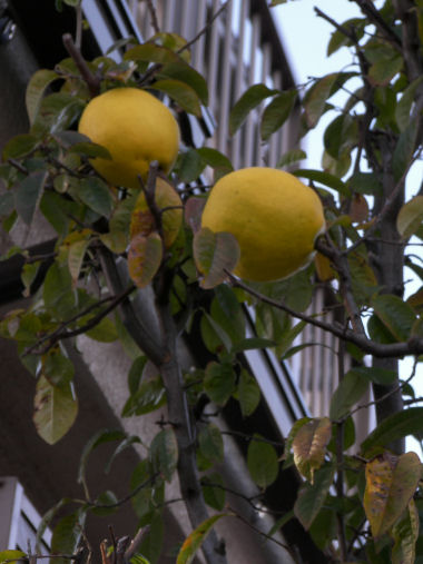 写真はマルメロ?の実。散歩途中の家の庭から顔をのぞかせている。最初は実の大きさから夏ミカン?にしては色づきが早いなぁと思って見上げていたが、どうも葉っぱも違う。色・形からするとマルメロだろうと思うんだけど自信はない。 | |