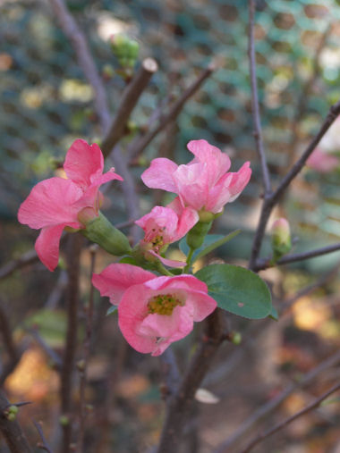 今日の写真は、最近になって木の名前が分かった花。 「寒木瓜(カンボケ)」 木瓜=真っ赤な花 と思っていたのですぐには分からなかったが、どうやら寒木瓜にはこうした ピンク系の花も結構あるらしい。11月末頃からチラホラ咲き始め、最近は花の数が増えてきた。殆ど花のない季節だけに、こんな可憐な花が咲いているとつい立ち止まって見入ってしまう。 | |