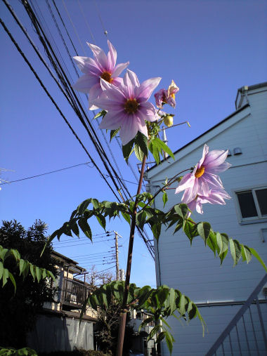 12月に入って、先週末 ちょっと早めの実質的仕事納めを終えて、週末に親族の亡年会で諏訪へ。 2組の若夫婦とその親 合計 10人の和気あいあいの忘年会で盛り上がった。 写真は、いつもの散歩コースを少し外れた駐車場の隅に咲いていた木立ダリア(皇帝ダリア)。2m以上もある花の高さで、見上げる姿勢になりどうしても空が入って逆光気味になってしまう。 | |