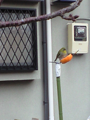いつも散歩する時、道路わきの民家の庭に、ミカンを棒に刺して野鳥のえさにしている家がある。しかし、散歩で通り過ぎる限り、この実を食べに来ている鳥は見なかった。 それが今朝の散歩時、メジロが止まってしきりに実をつついていた。桜の枝に隠れながらそっと近づいてみたが、若干気にしている雰囲気はあるが、逃げることはしない。よほど腹がすいているのか、たまに頭をあげて周りを見回すが、またついばんでいる。 かなり近づいて、携帯の内蔵カメラでもこの程度に撮れた。今まで見たメジロはつがいで行動することが多かったが、このメジロは一羽だけだった。 | |