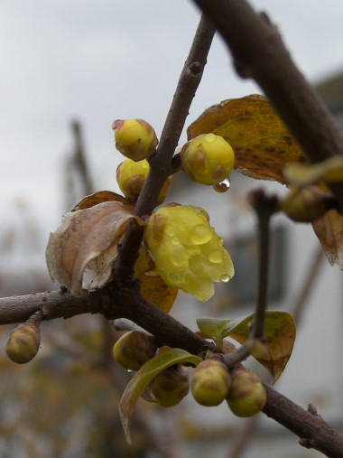 昨夜の寒い雨がなんとか上がって、今朝の空は不承不承のような曇天。 散歩途中のロウバイの木を見ると、まん丸なつぼみが大きくなっている。もしかして、と思って何時もの散歩コースから若干足を延ばして、別のロウバイの木を見に行った。 思惑通り、やっと一輪だけ花がついていた。つぼみも花も昨夜の雨露をつけたまま。 | |
