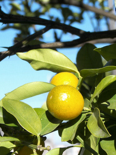 写真は、正月飾りにも使われるキンカンの実。朝日を受けて金色に輝いて青空に映えている。 | |